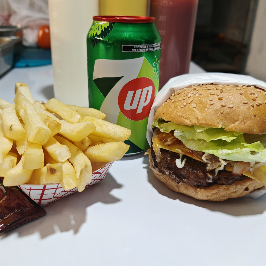 Pan, dos carnes, queso amarillo, lechuga, tomate, cebolla, pepinillos, mayonesa, mostaza y catsup.