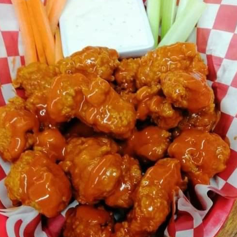 1/2 Kg de Boneless, bañados con tus salsas preferidas, porción de papas Fritas, verduras y Ranch