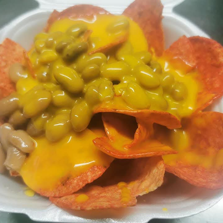 Doritos nachos, frijoles queso amarillo y chiles curtidos
