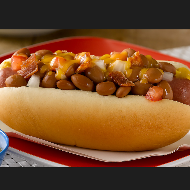 HOTDOG TRADICIONAL. Pan bimbollo, salchicha, frijoles, tomate, cebolla, pepinillos, mayonesa, mostaza y catsup