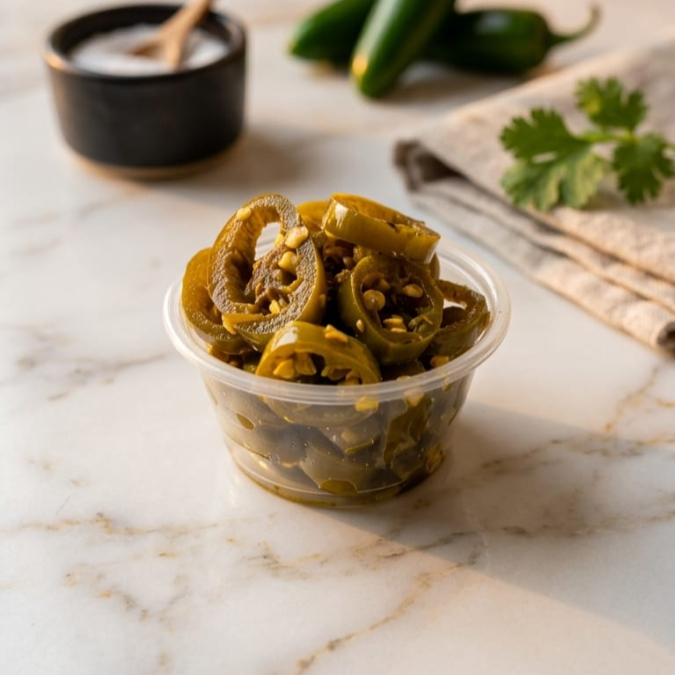 Deliciosas papas fritas doraditas, crujientes y calientitas con un salsita de Jalapeño