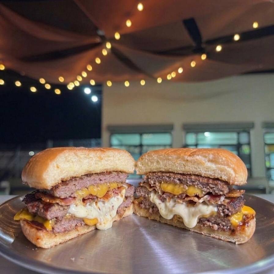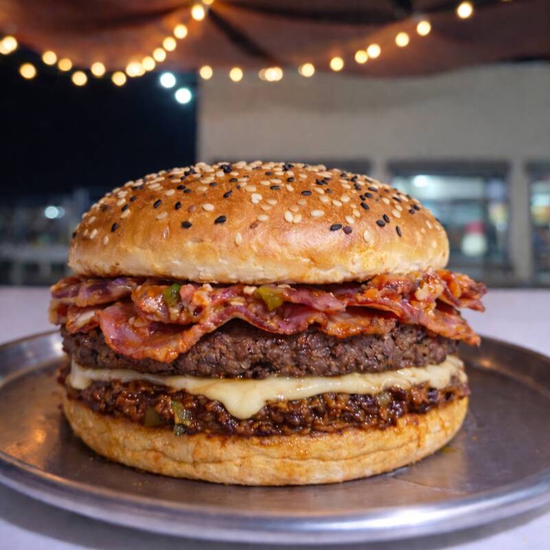 Smash de 3 carnes con doble queso cheddar, tocino crujiente y un baño de nuestra irresistible salsa de la casa