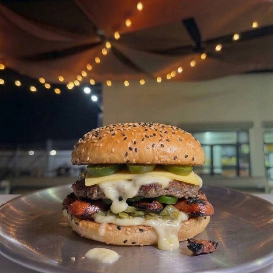 Smash de 2 carnes con salchicha para asar, extra queso manchego, chile california y una porcion generosa de chile serrano