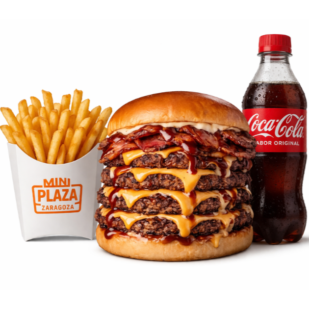 Smash de cuatro carnes, triple queso cheddar, cuatro tiras de tocino crujiente, todo esto bañado en nuestra irresistible salsa de la casa y BBQ