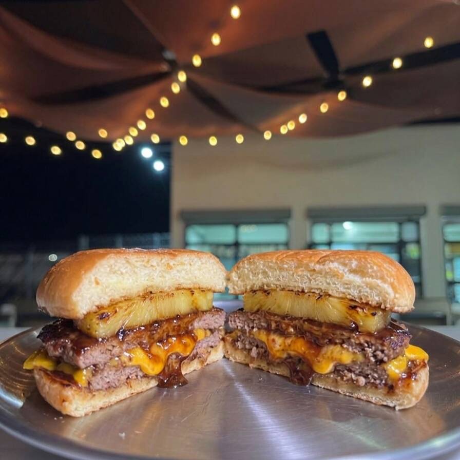Smash de dos carnes con queso cheddar, una jugosa rebanada de piña bañada con nuestra irresistible salsa teriyaki especial
