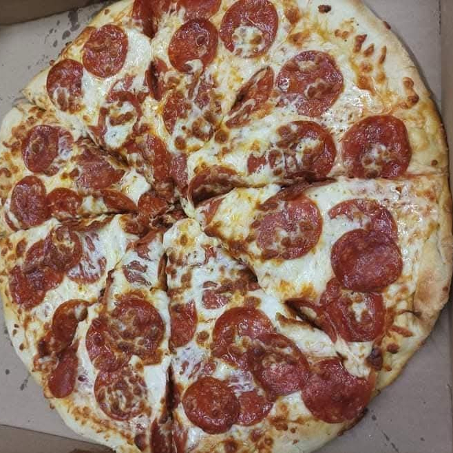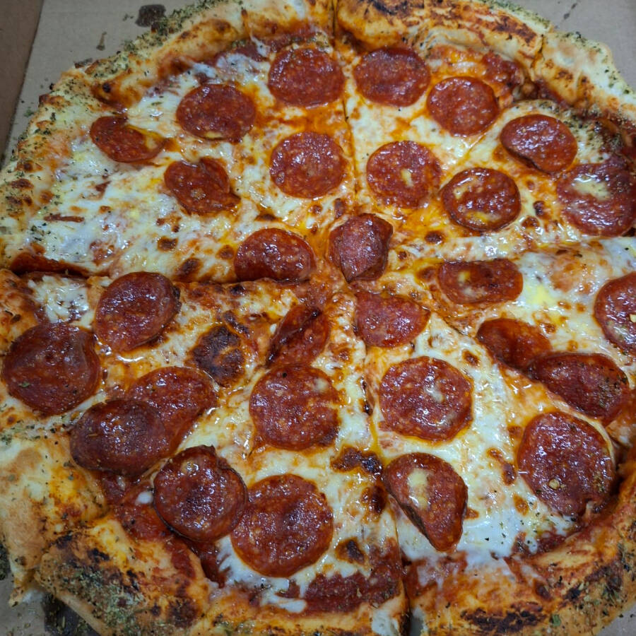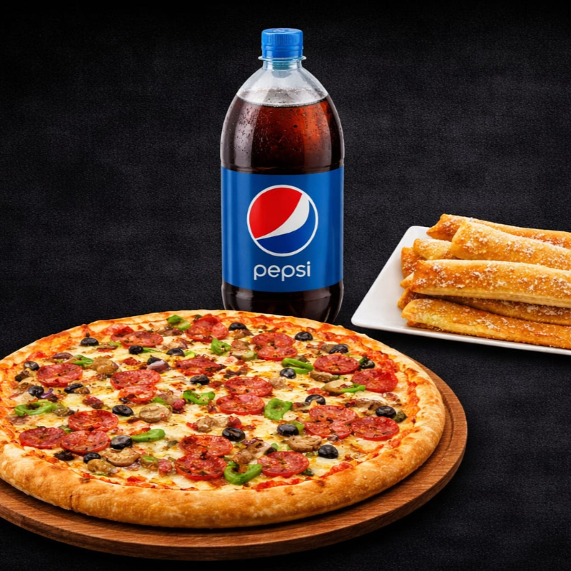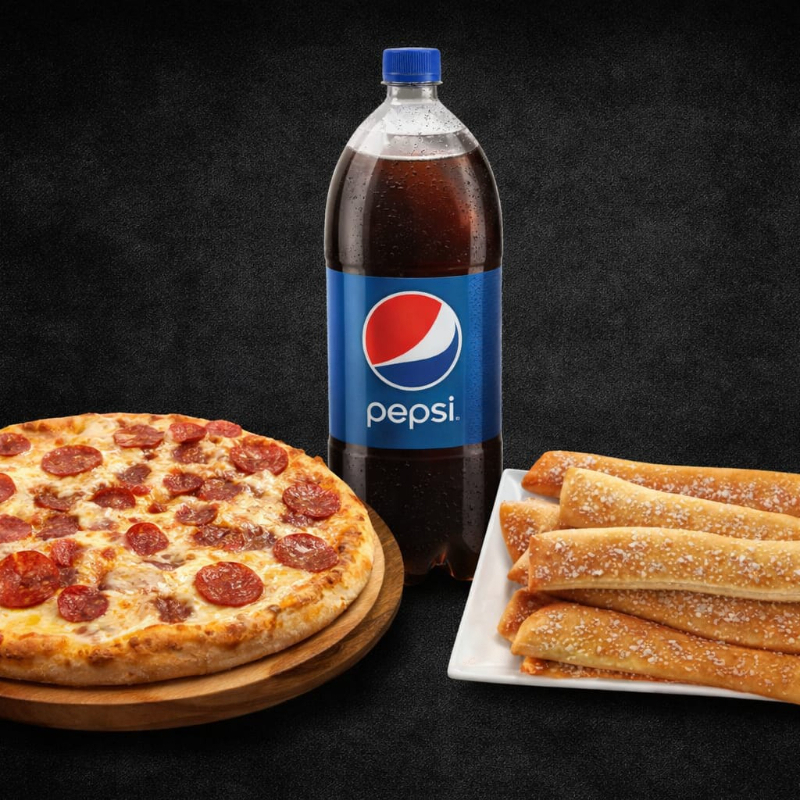 1 pizza de Peperoni, 1 orden de panecillos de ajo, 1 refresco de 2 litros