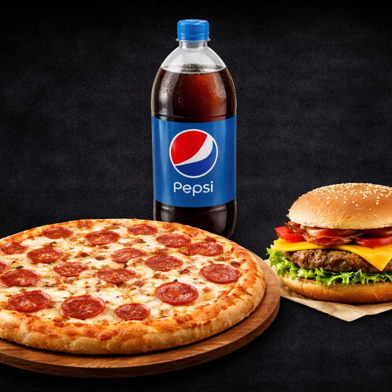 1 pizza de Peperoni, 1 hamburguesa, 1 refresco de 2 litros