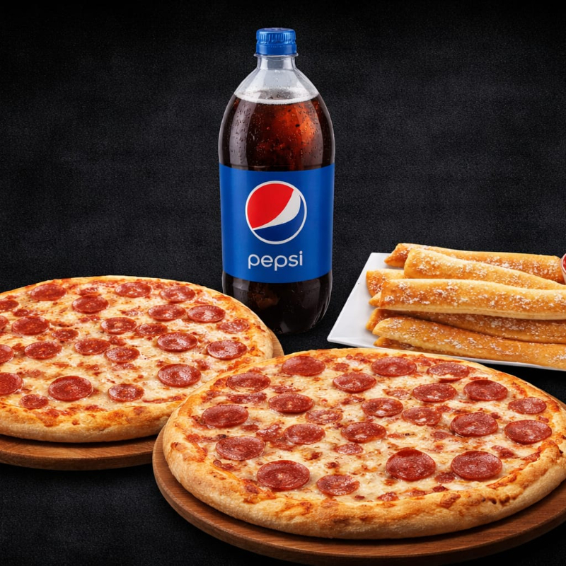 2 pizzas de Peperoni, 1 orden de panecillos de ajo, 1 refresco de 2 litros