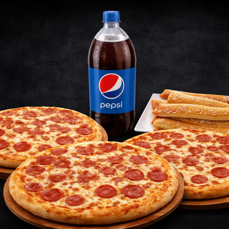 3 pizzas de Peperoni, 1 panecillos de ajo, 1 refresco de 2 litros