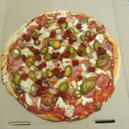 (Peperoni, jamón, champiñones, piña, jalapeños y chorizo)