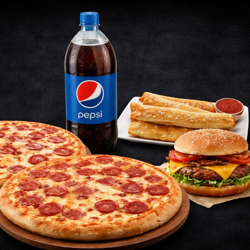 2 pizzas de Peperoni, 1 panecillos de ajo, 1 hamburguesa, 1 refresco de 2 litros