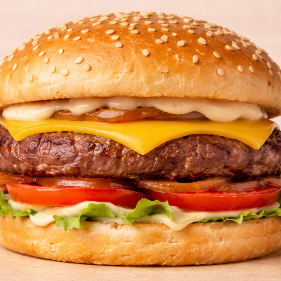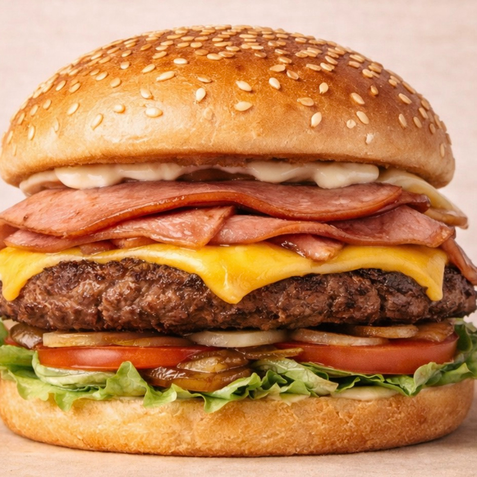 Doble carne de res, queso, lechuga, tomate cebolla caramelizada y aderezos.