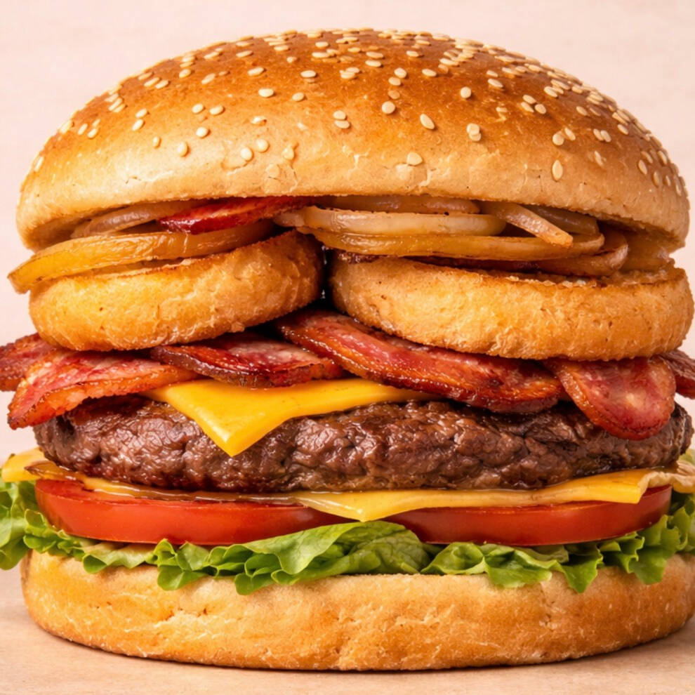 Carne de res, tocino, aros de cebolla, queso, lechuga, tomate, cebolla caramelizada y aderezos.