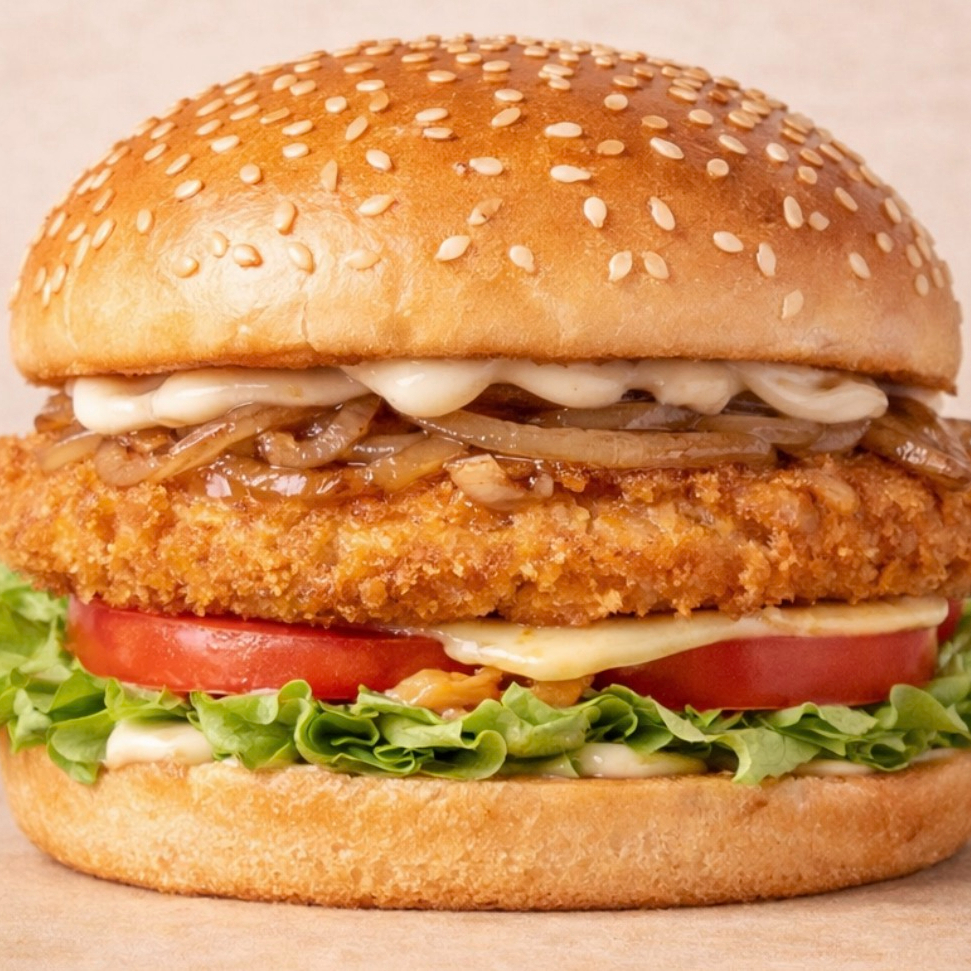 Pechuga de pollo empanizada, queso, lechuga, tomate, cebolla caramelizada y mayonesa.