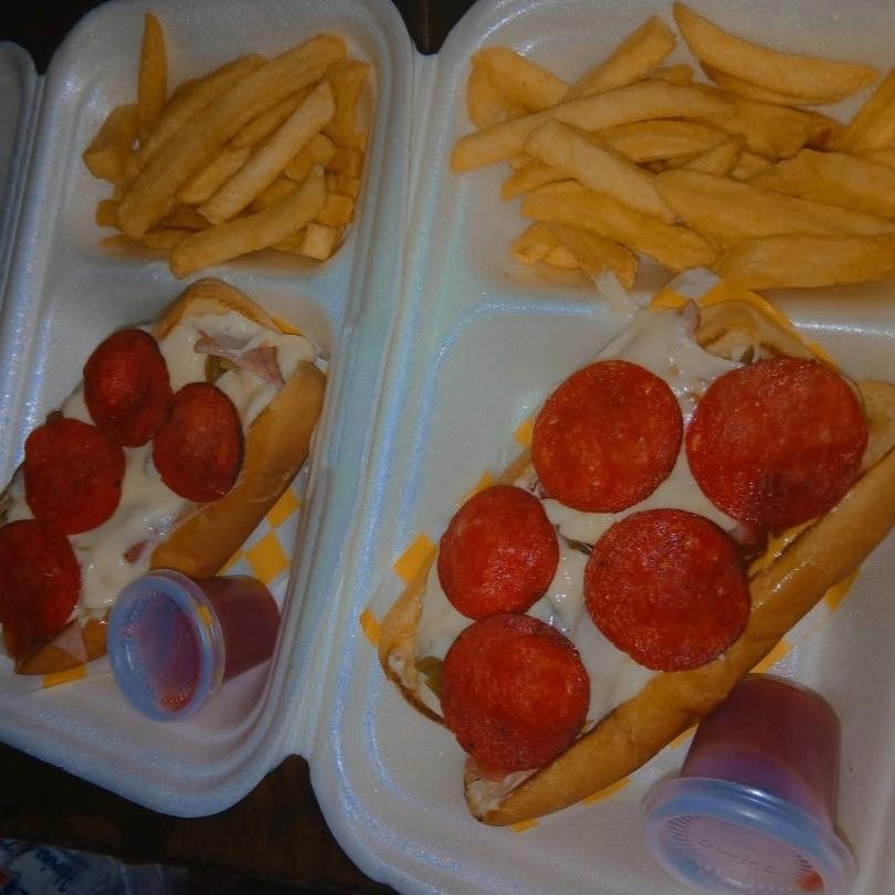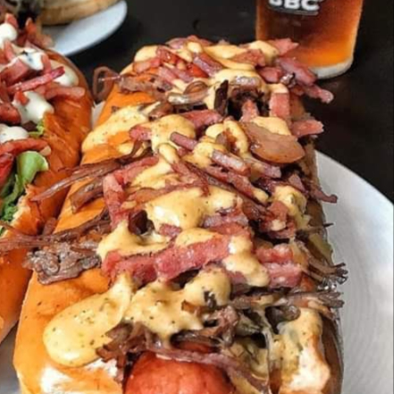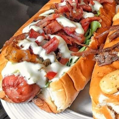 Salchicha, verduras, aderezos, peperoni,tocino frito y mozarella (encima)