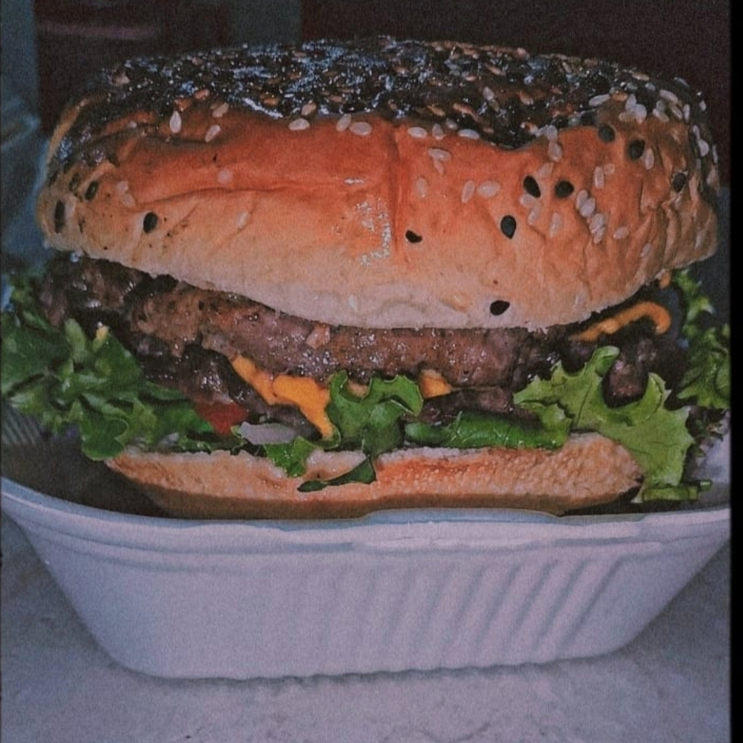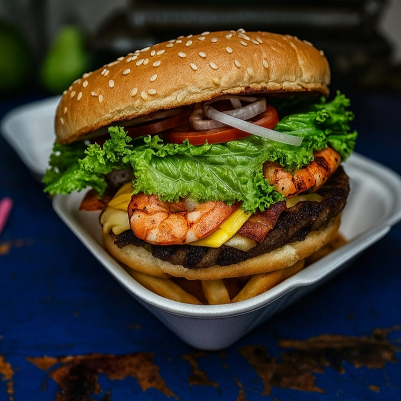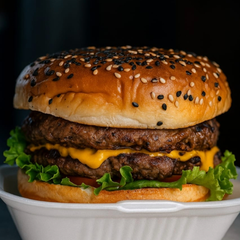Doble carne, doble queso amarillo, doble tocino y verduras.