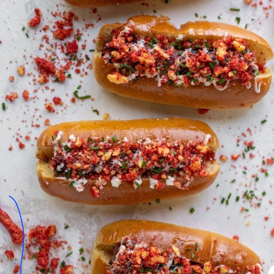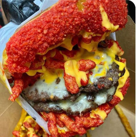 Doble carne, Doble queso, chetos Flaming Hot y pan empanizado con chetos Flaming Hog