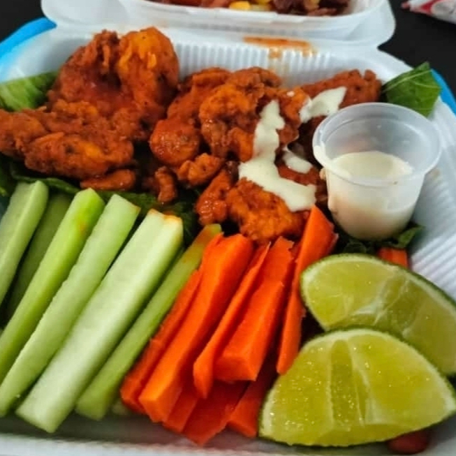 Boneless con salsa búfalo, queso amarillo, tocino y verduras.