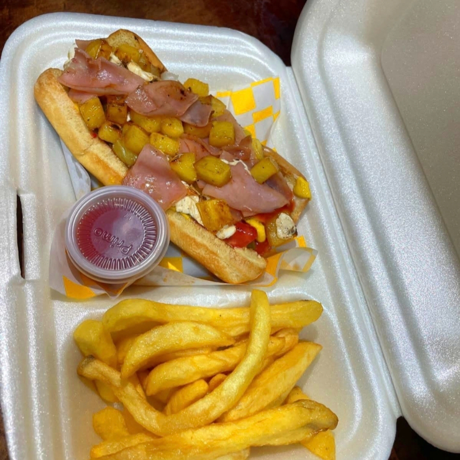 Salchicha, verduras, aderezos, jamón, queso y piña asada.