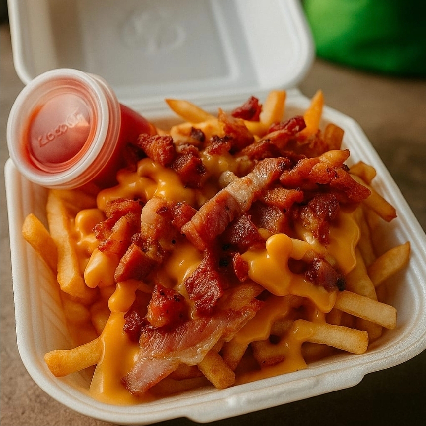 Papas bañadas con queso para nachos y tocino frito