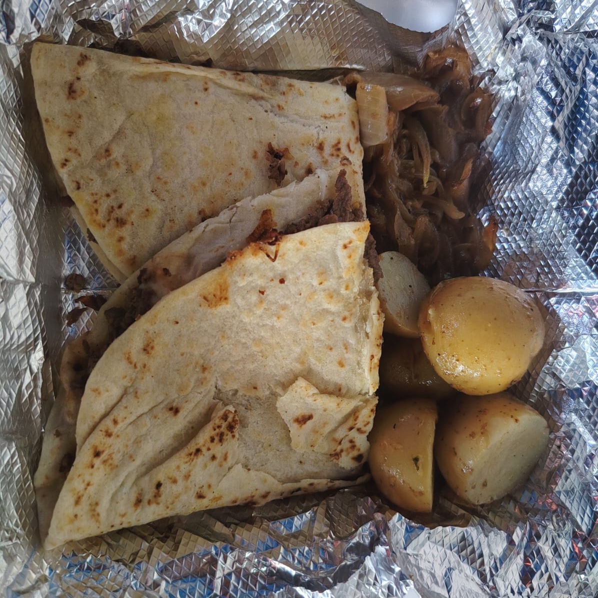 Tortilla de harina rellena de queso asadero fundido, frijoles refritos y bistec sazonado. Acompañada de papas al vapor con mantequilla y porción de frijoles.