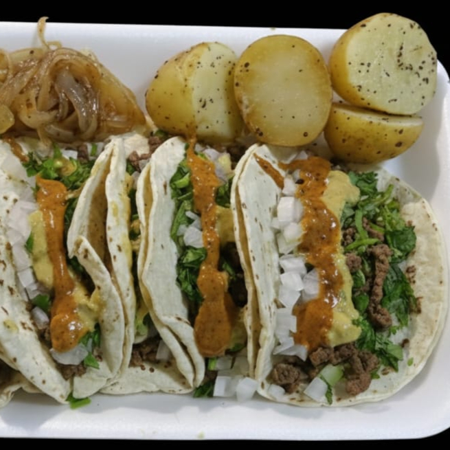 Cinco tacos en tortilla de maíz con carne de bistec sazonada, acompañados de papas al vapor con mantequilla y porción de frijoles.