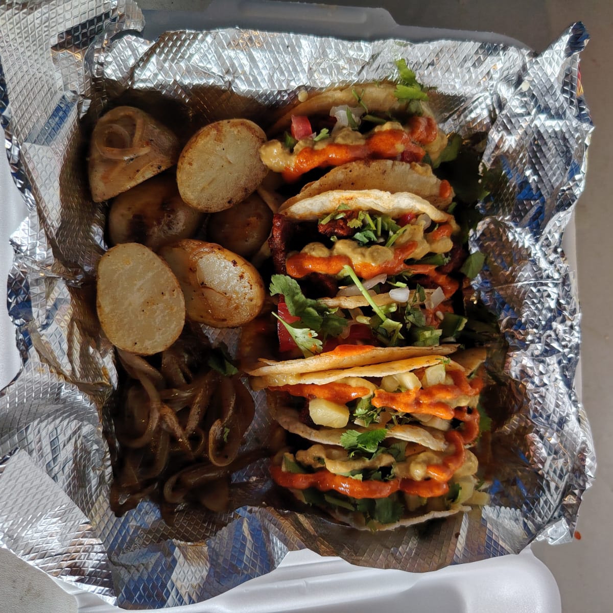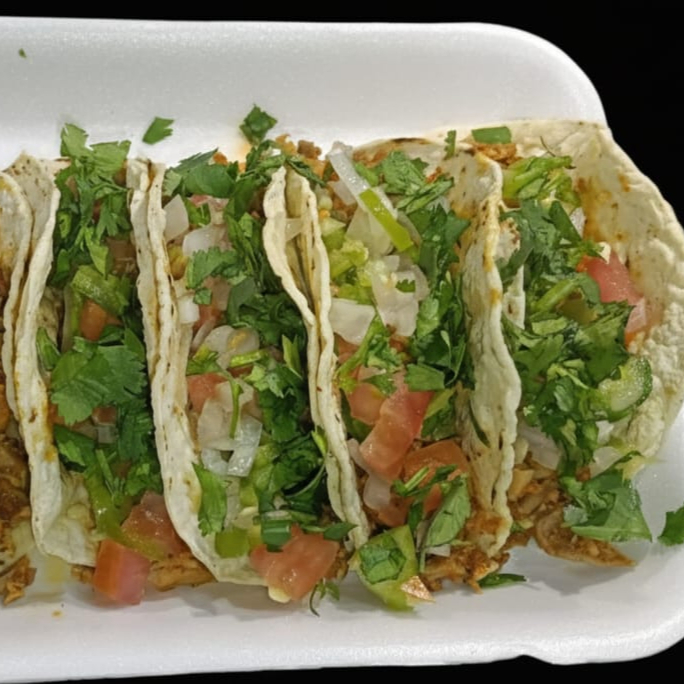 Cinco tacos en tortilla de maíz con carne al pastor sazonada, acompañados de papas al vapor con mantequilla y porción de frijoles.