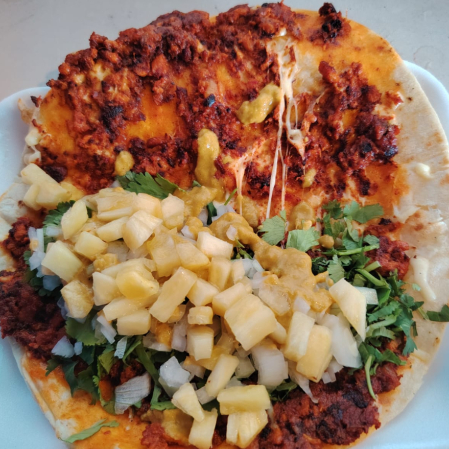 Tortilla de harina rellena de carne al pastor y queso asadero fundido, acompañada de papas al vapor con mantequilla y porción de frijoles.