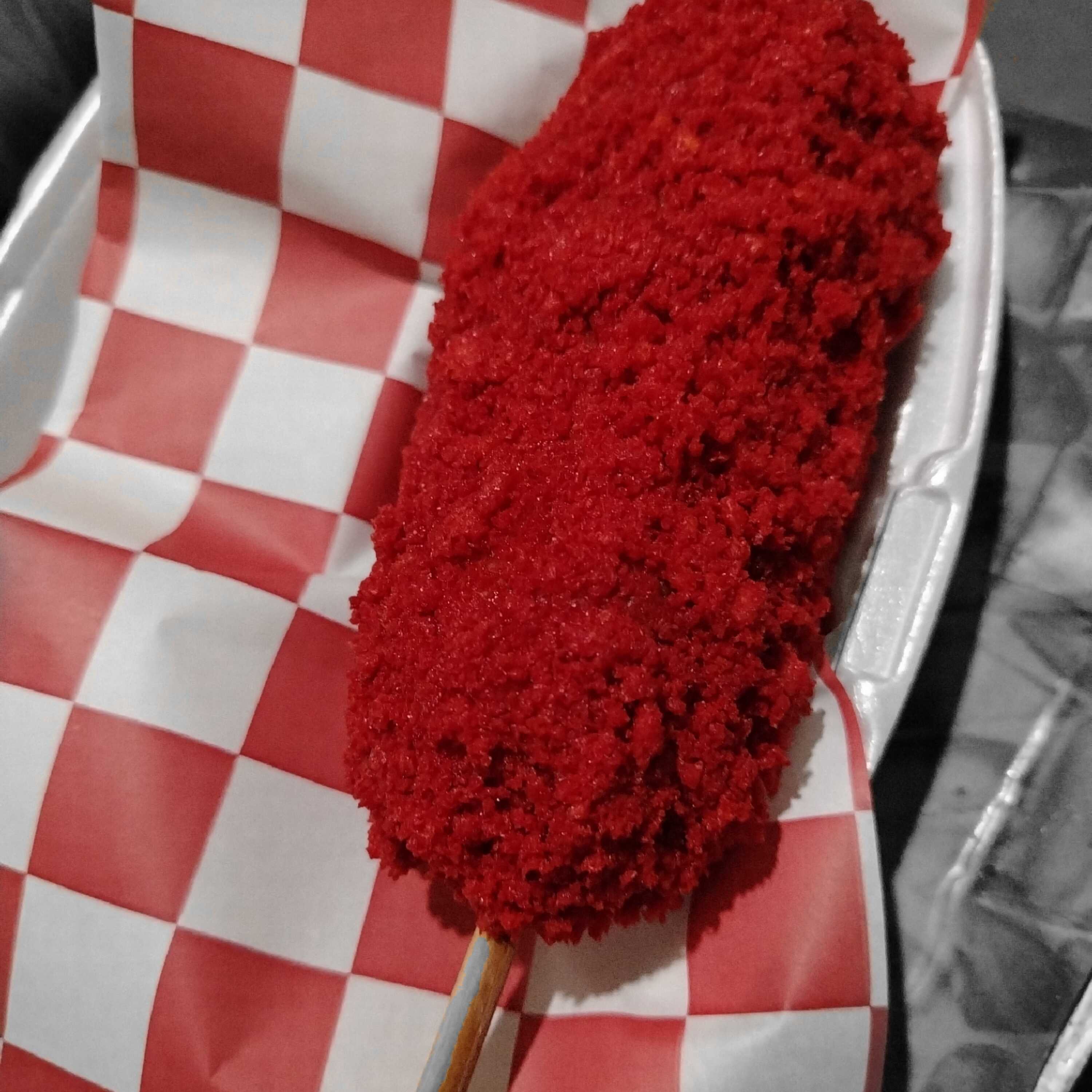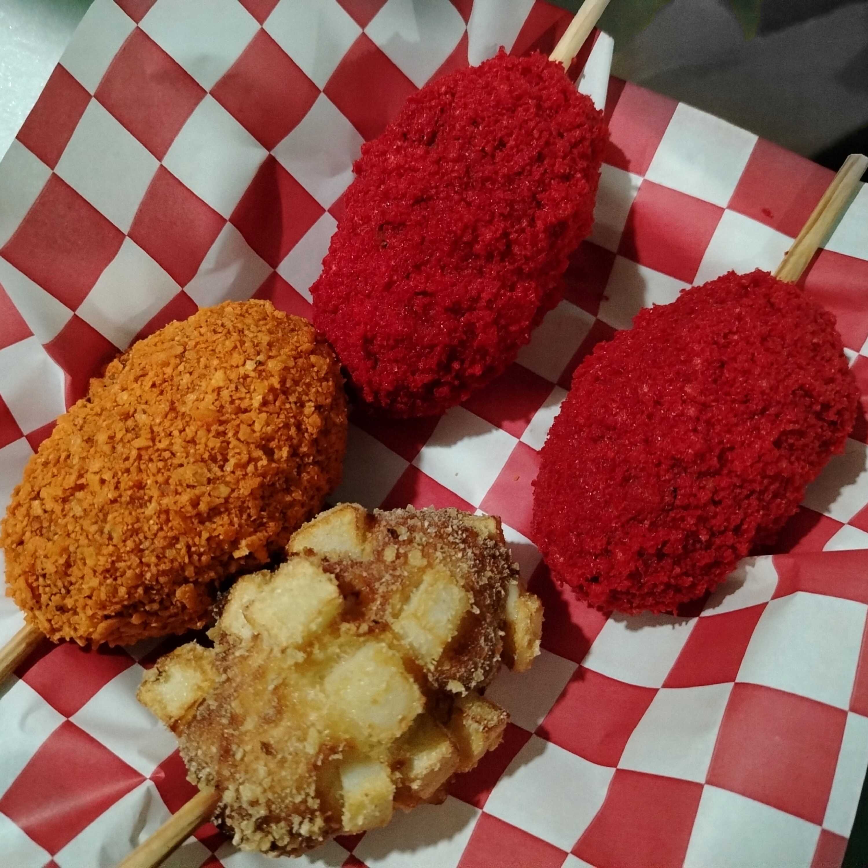 Banderilla rellena de salchicha, cubierta de chetos flaming hot y panko.