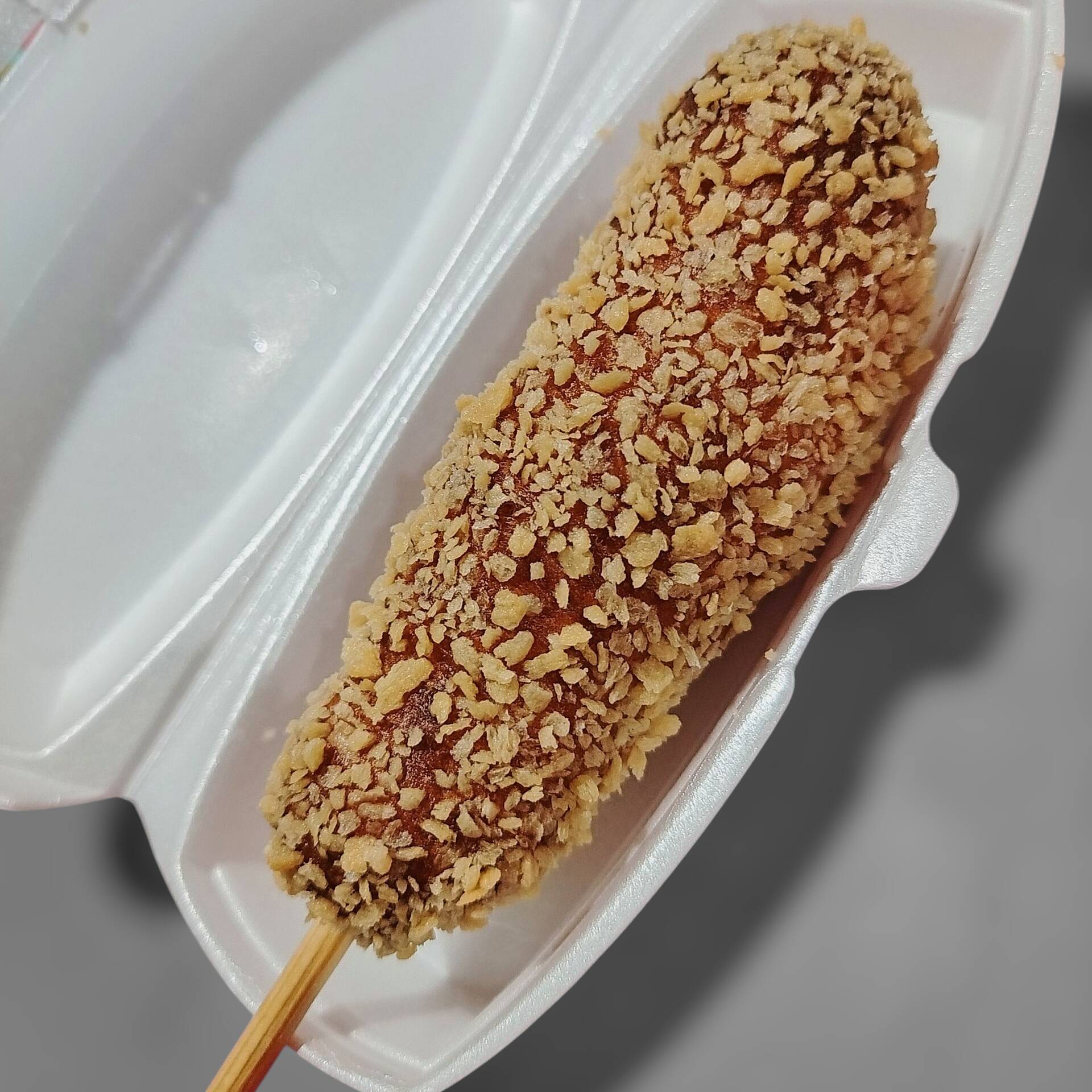 Banderilla rellena de salchicha, cubierta de ramen coreano y panko.