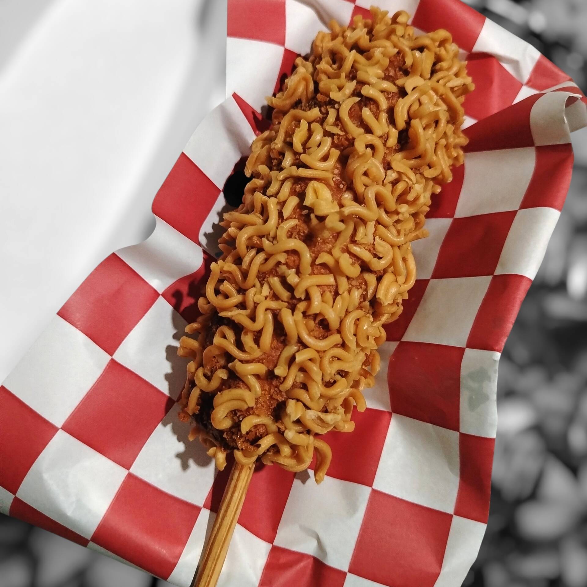 Banderilla rellena de queso gouda y salchicha, cubierta de ramen coreano y panko.