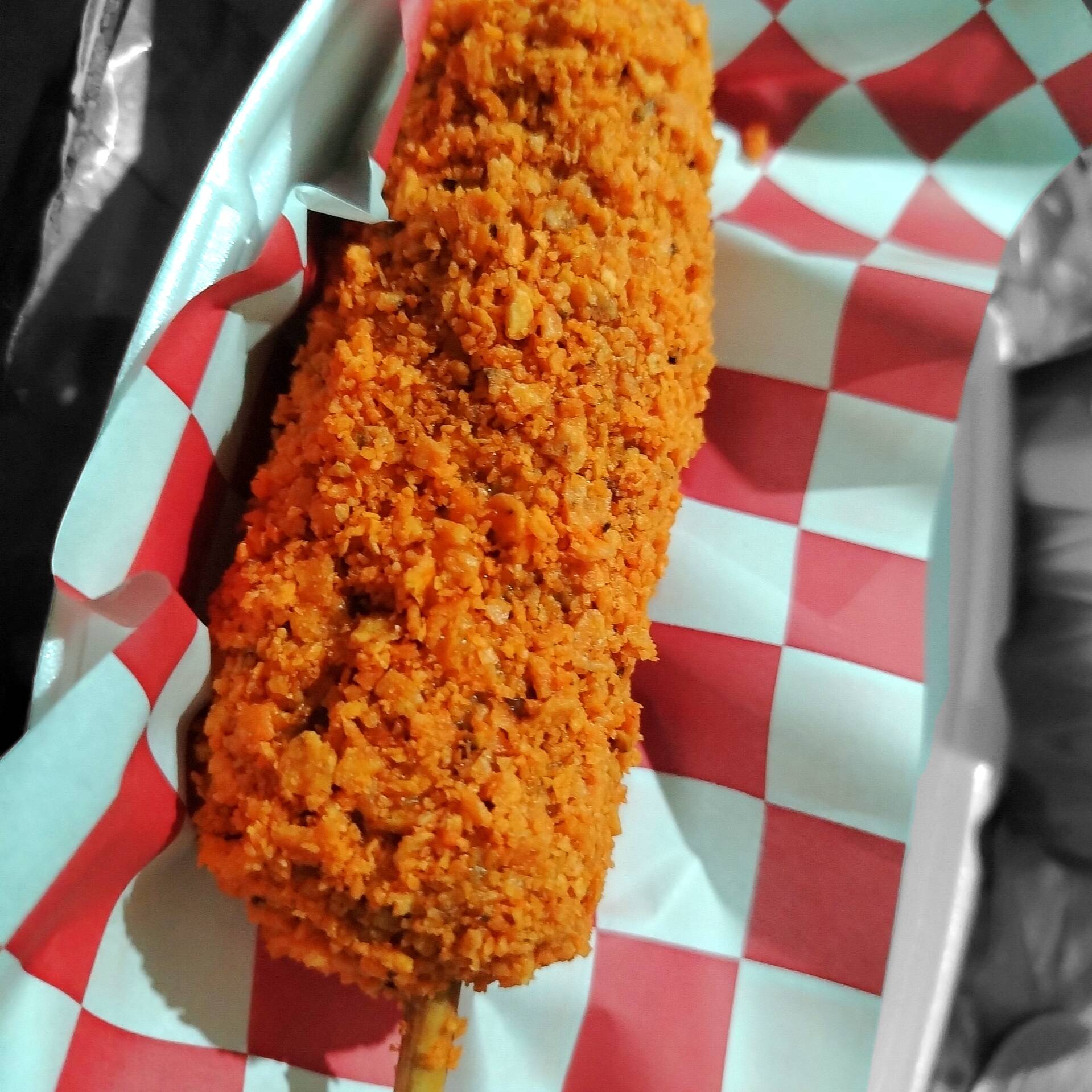 banderilla rellena de salchicha, cubierta de doritos nacho y panko