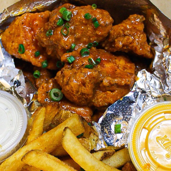 Pollo frito, natural o bañado en salsa mr, queso cheddar y jalapeños troceados.