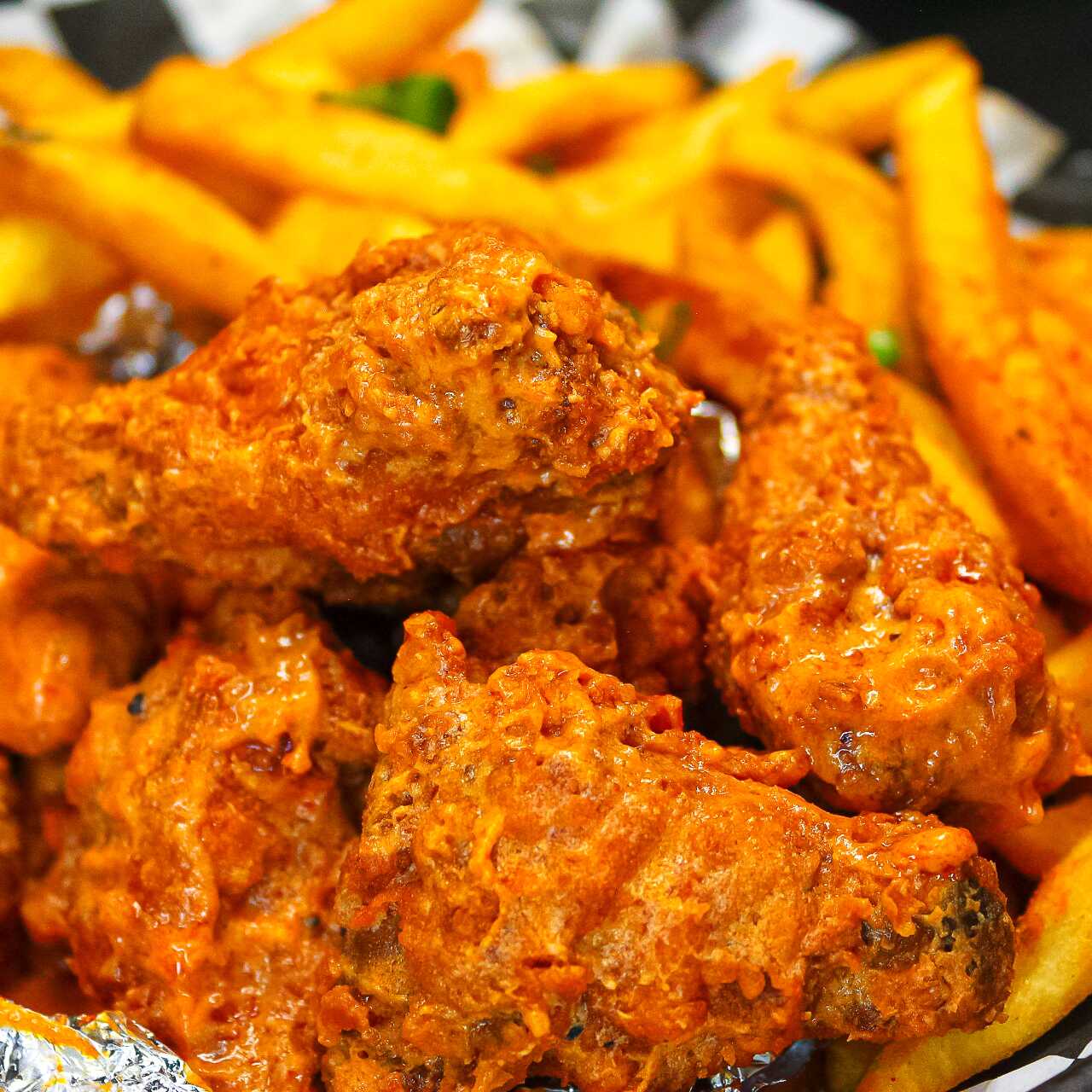Alitas de pollo crujientes bañadas en cualquier de nuestra salsa originales.