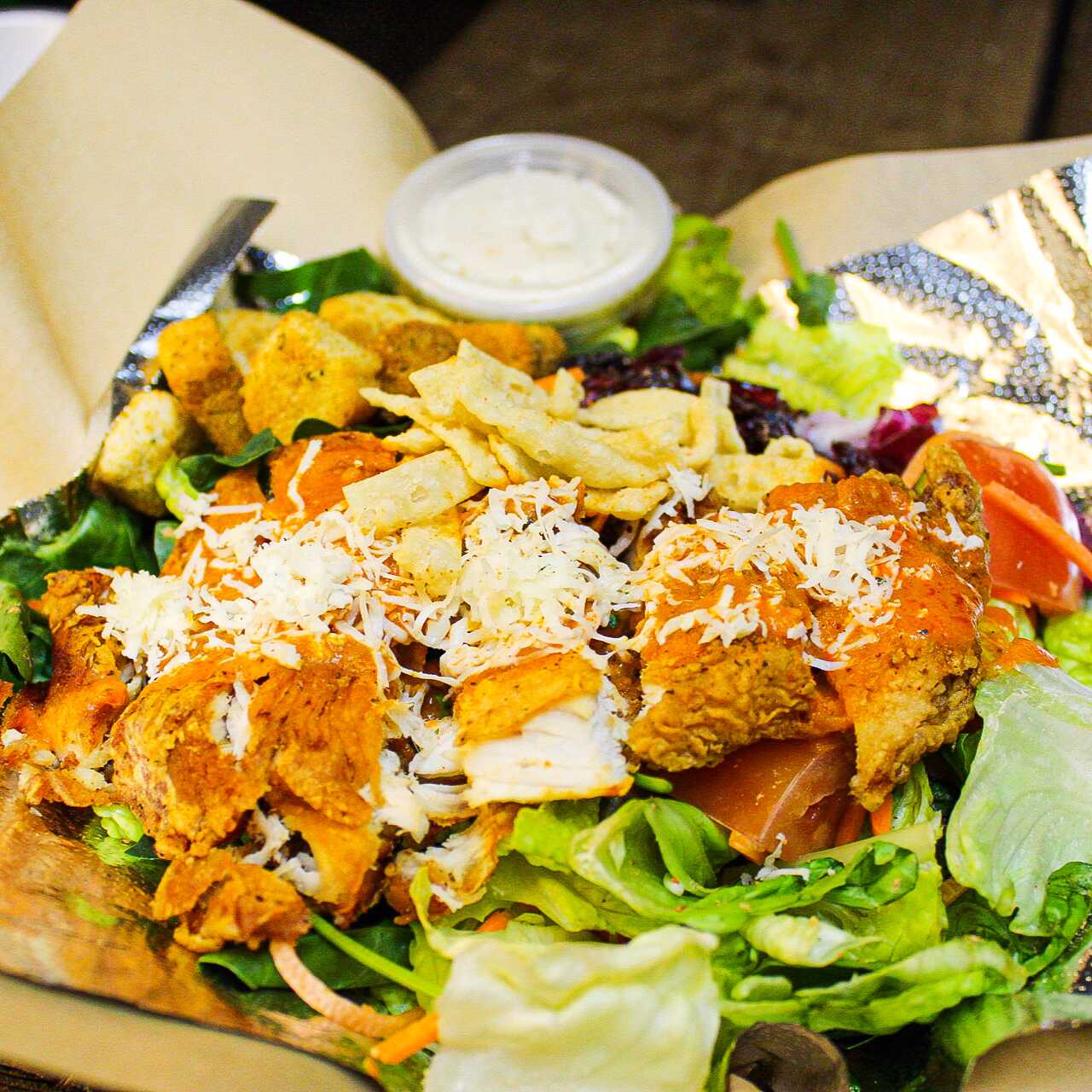 Ensalada de pollo crispy bañada en cualquiera de nuestras salsa originales.