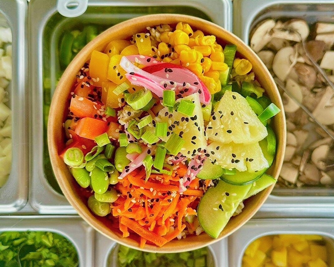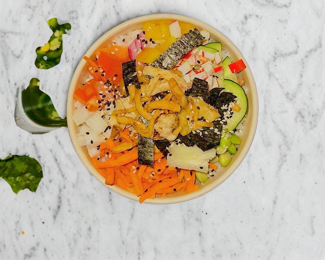 Pollo, pepino, edamames, zanahoria, tomate, chile marrón, cebolla dulce, jalapeño, elote, piña, cebollín, ajonjolí, honey sriracha, cítrica sauce y teriyaki.
