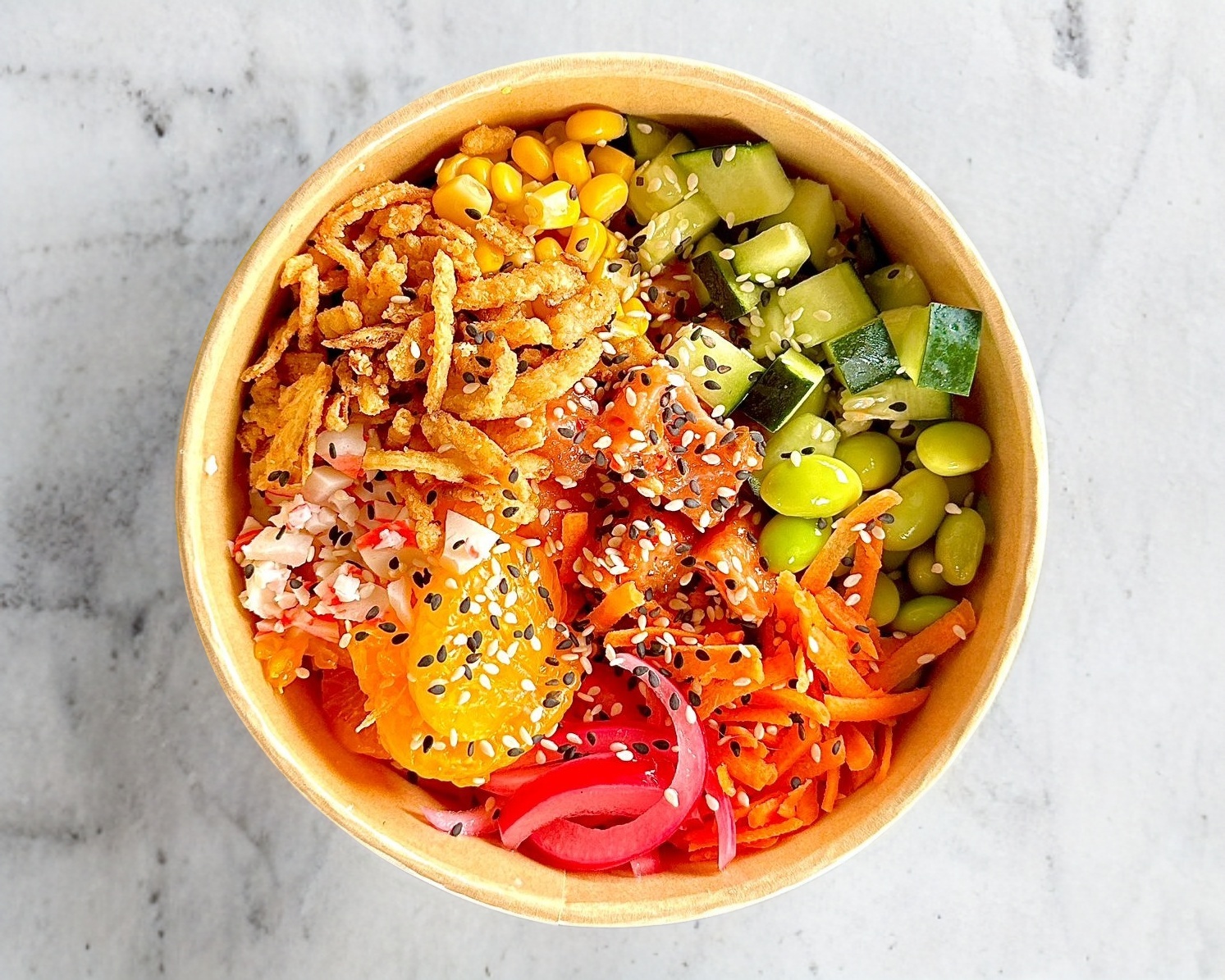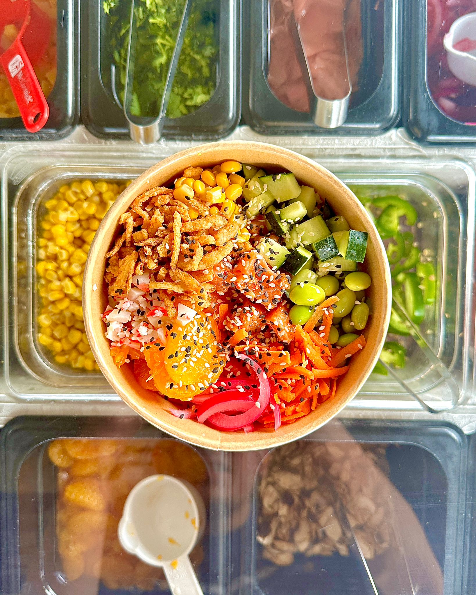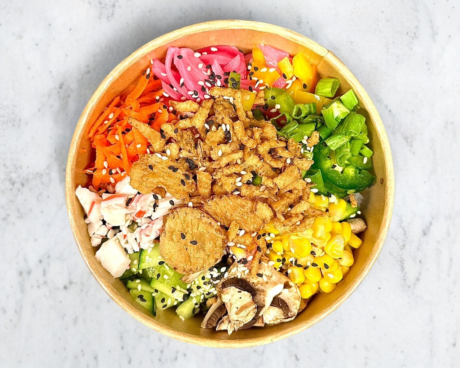 Salmón, pepino, zanahoria, cebolla dulce, chile morrón, jalapeño, champiñones, elote, surimi, cebollín, ajonjolí, cebolla caramelizada, my-poke sauce y cream sriracha.