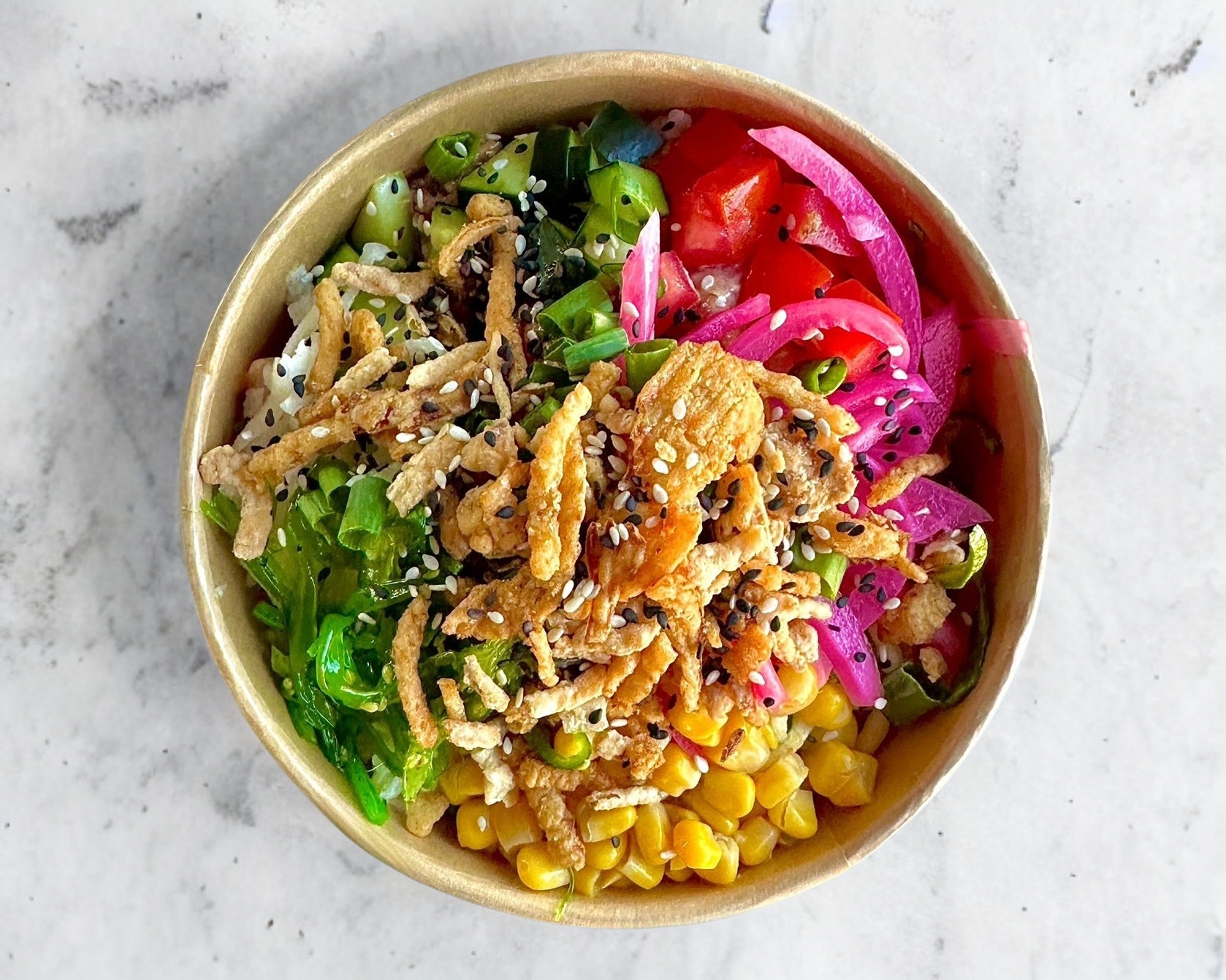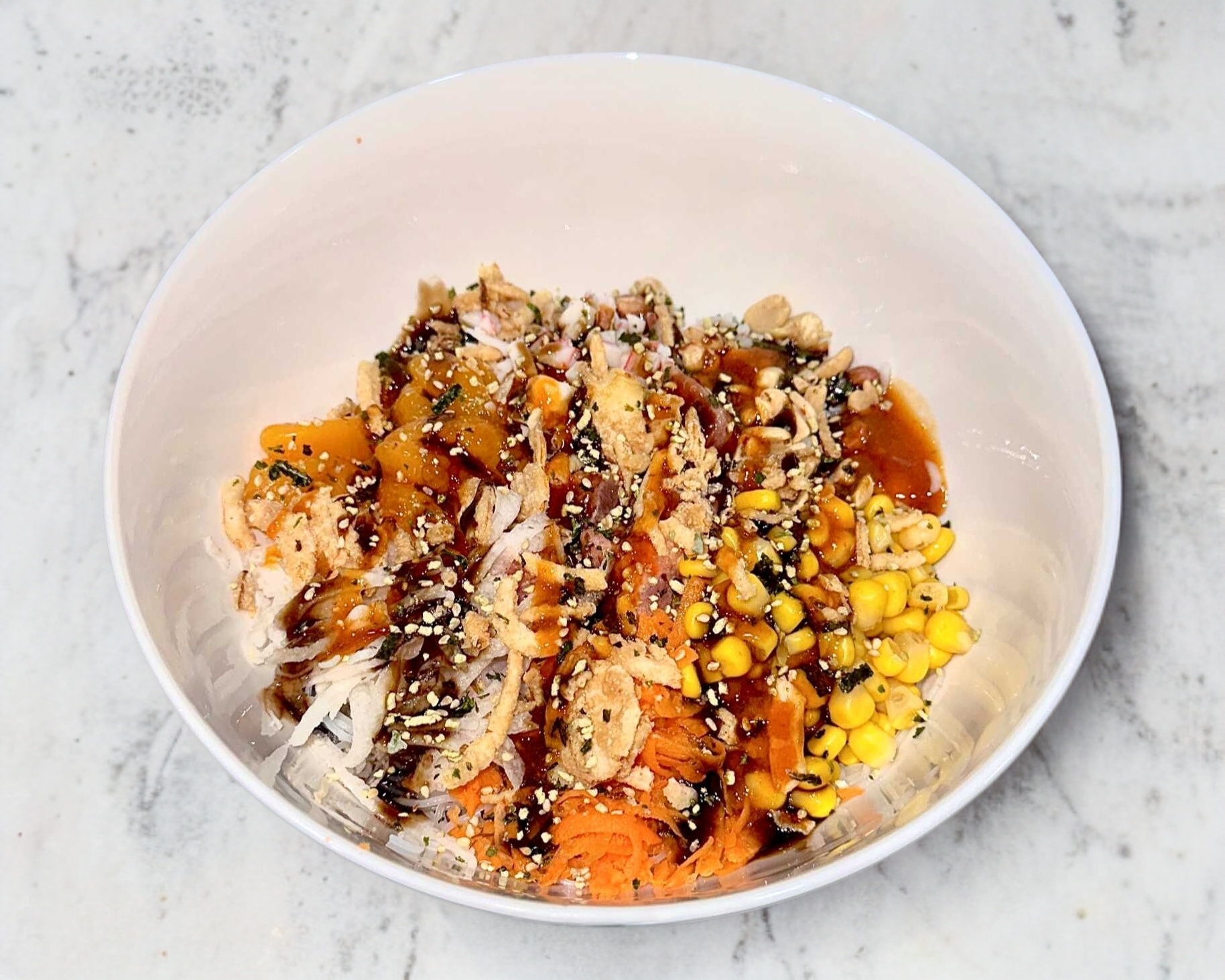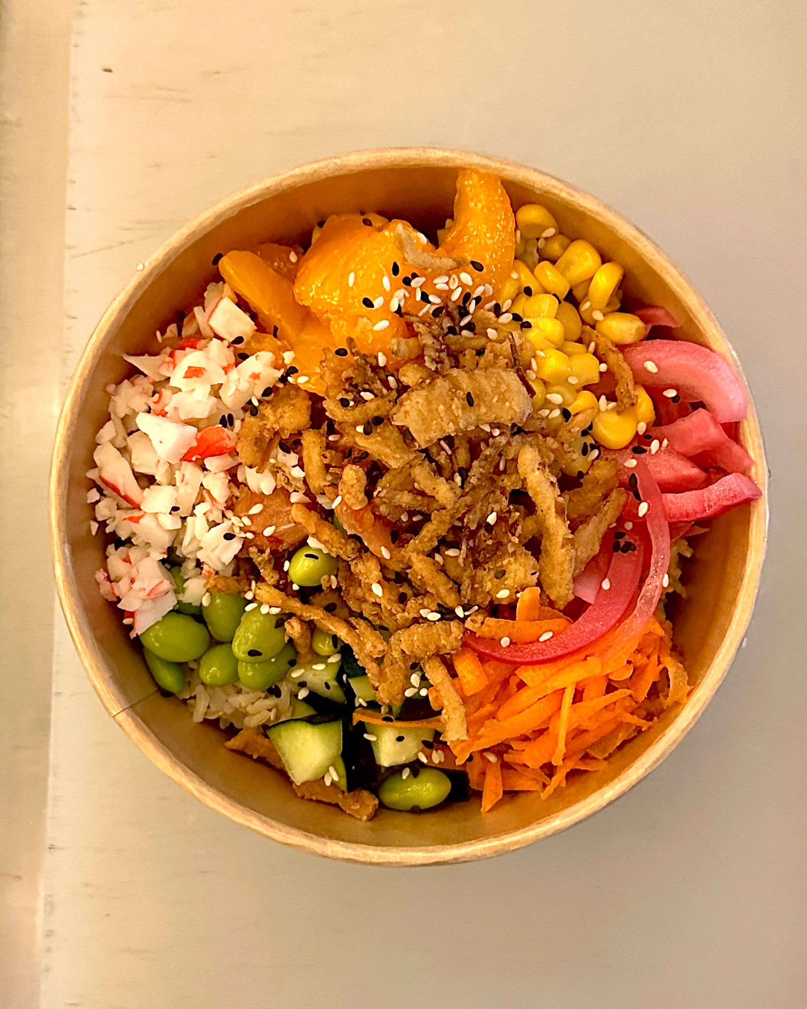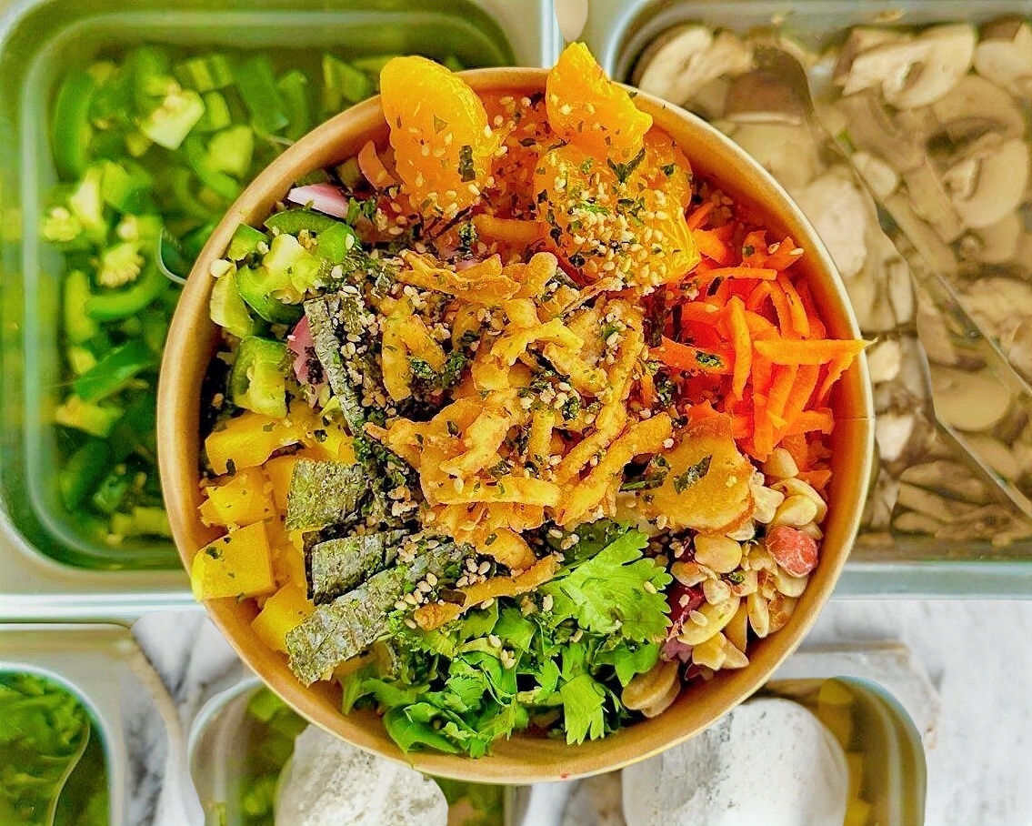 Salmón, pepino, zanahoria, cebolla dulce, chile morrón, jalapeño, champiñones, elote, surimi, cebollín, ajonjolí, cebolla caramelizada, my-poke sauce y cream sriracha.