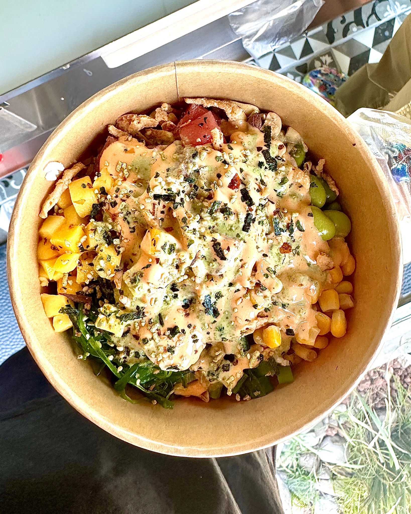 Camarón, pepino, tomate, chile morrón, elote, champiñones, jalapeño, mango, cebollín, furikake, anguila y honey sriracha.
