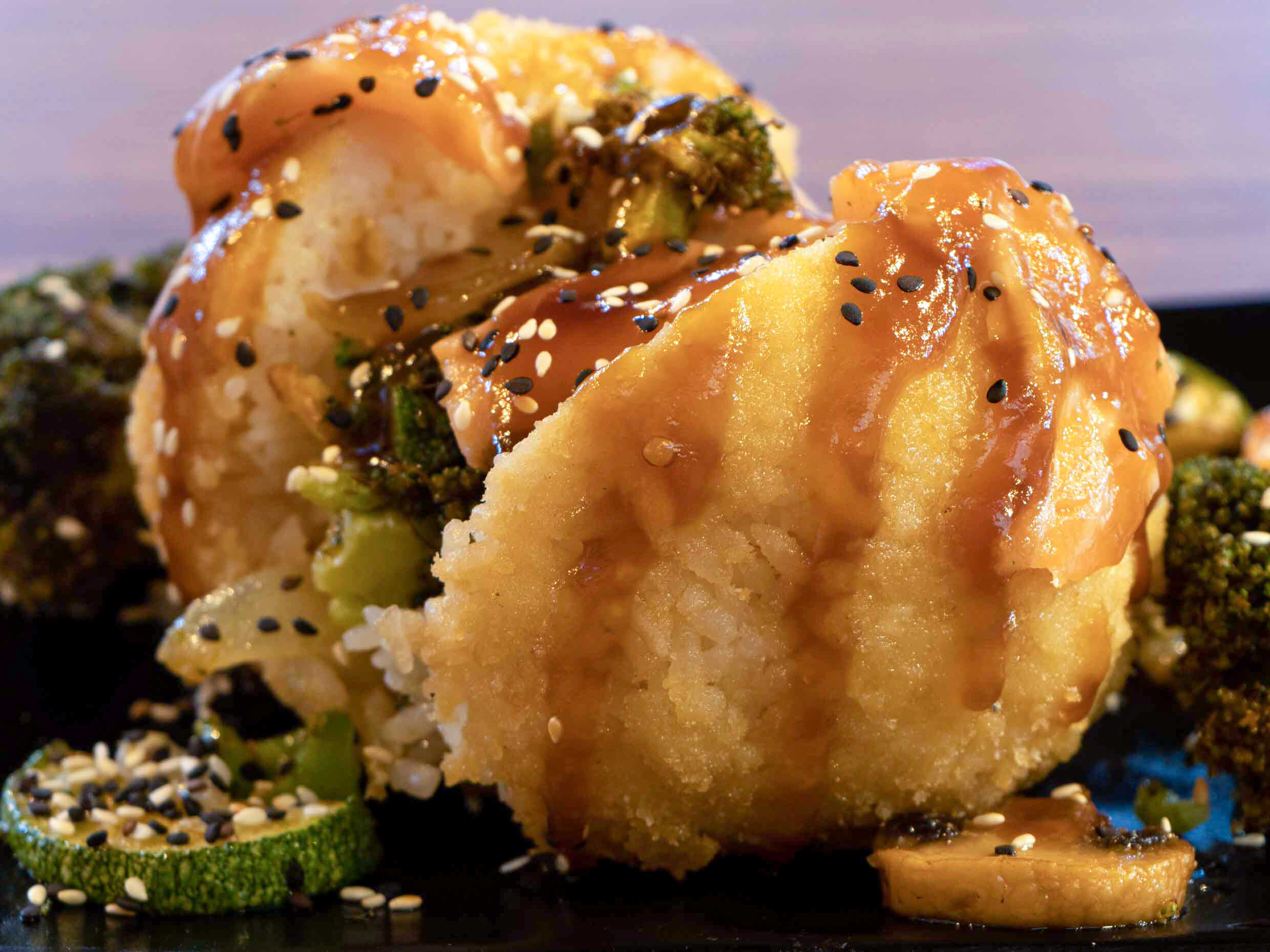 Cama de arroz, philadelphia, aguacate con salmon a la plancha,vegetales tepanyaki con semilla sesamo y salsa de anguila