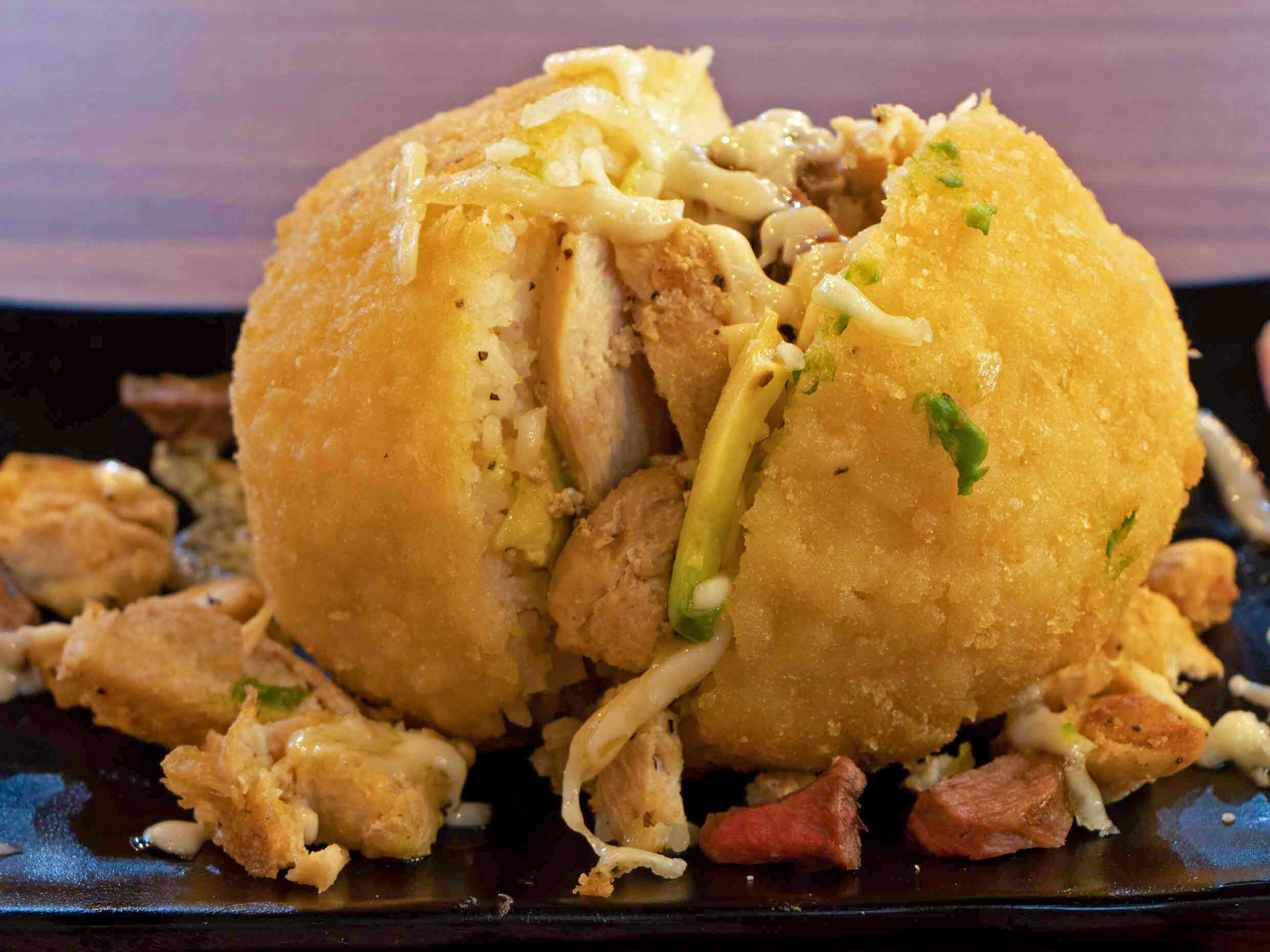 Rollo empanizado lleva pollo a la plancha,espinaca, aguacate y queso Philadelphia bañado en salsa chipotle