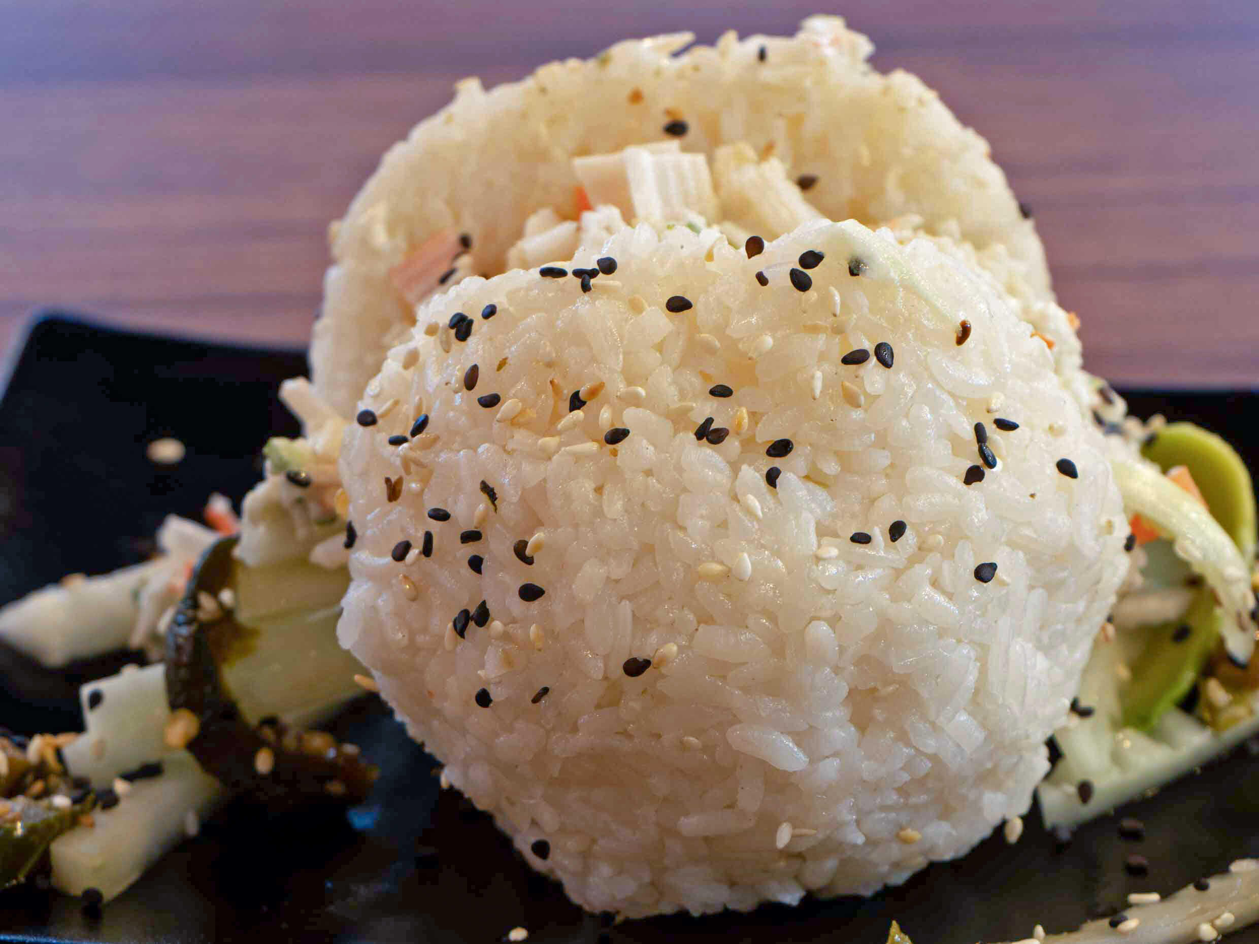 Cama de Arroz con pepino, aguacate, toreados, camaron empanizado, philadelphia por fuera y ajonjli.