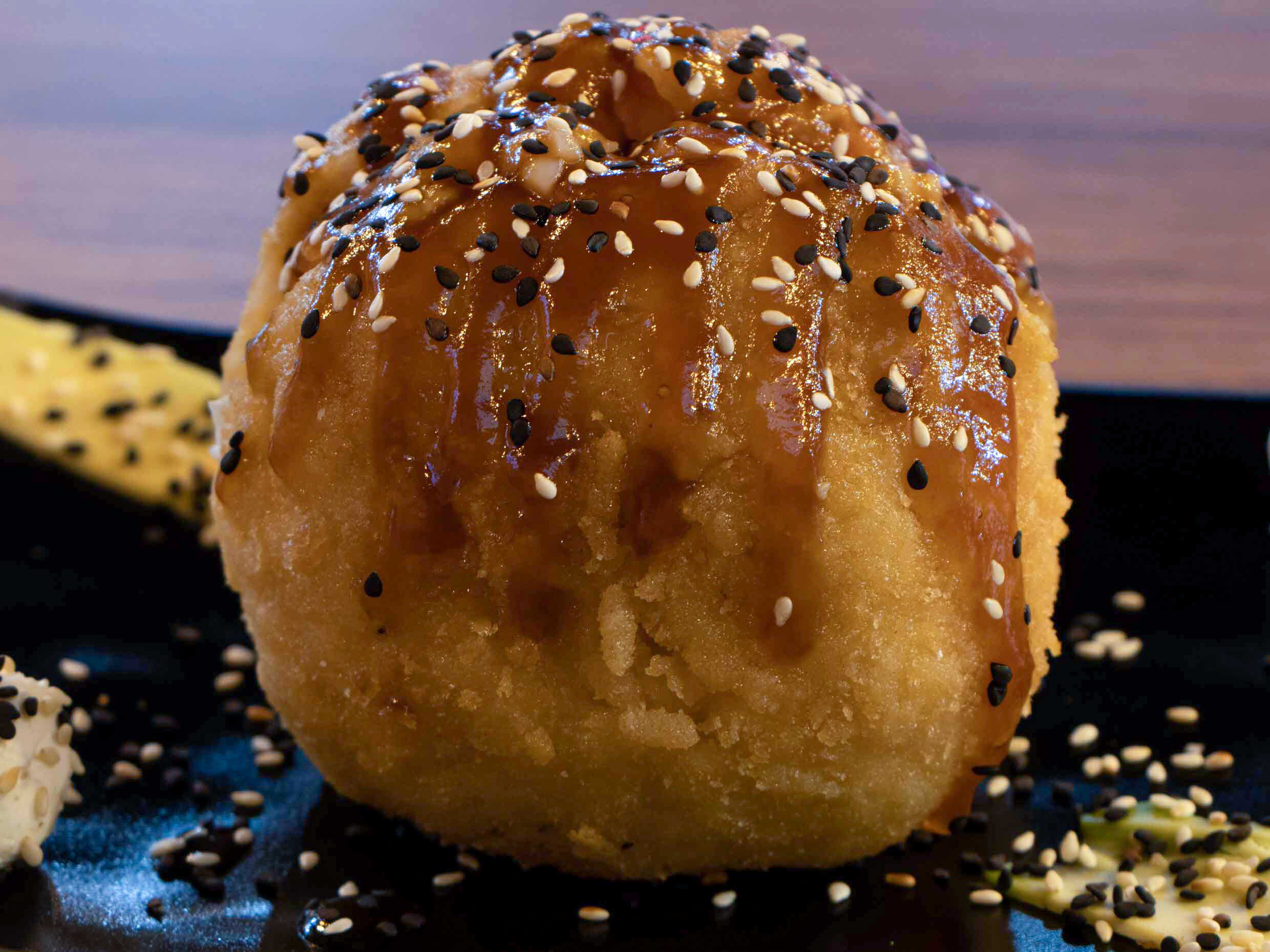Cama de arroz, Philadelphia, aguacate, cangrejo y camaron. Capeada en panko con salsa de anguila
