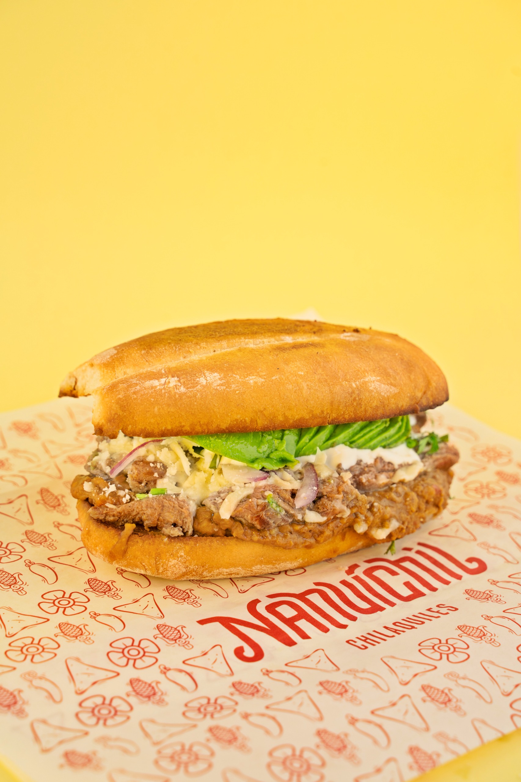 Pan con frijoles refritos, arrachera, aguacate y cebolla curtida.