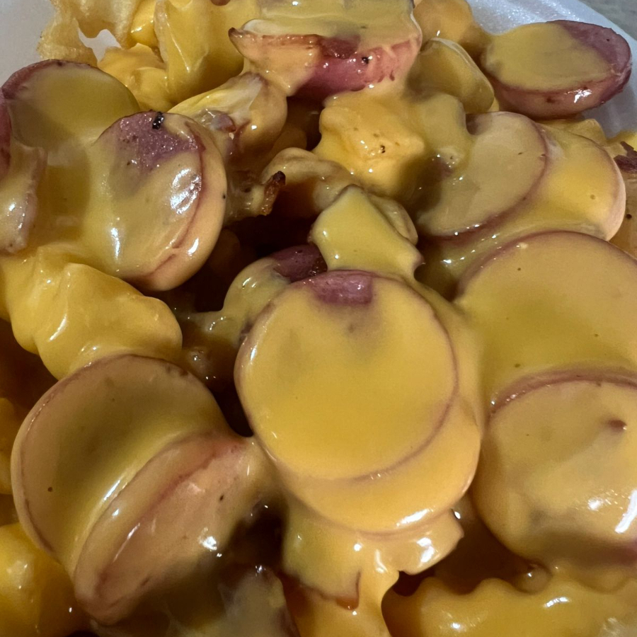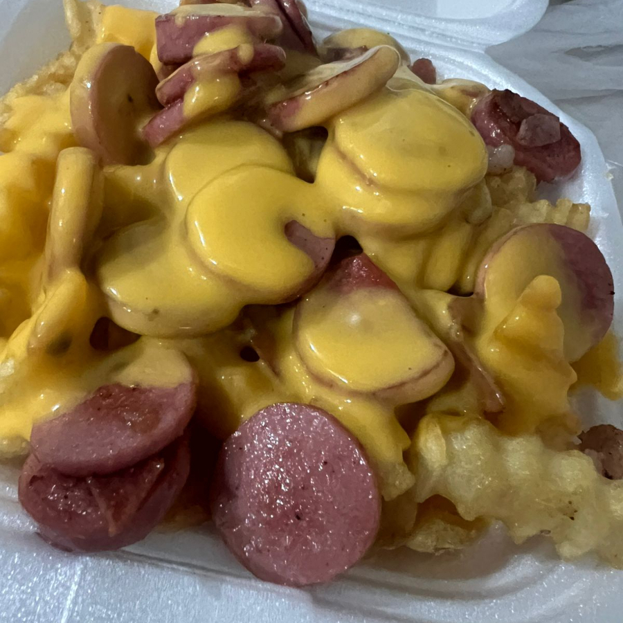 Nuestras ricas papas fritas acompañadas con Winnie troceado, rico tocino dorado y nuestro queso chedaar