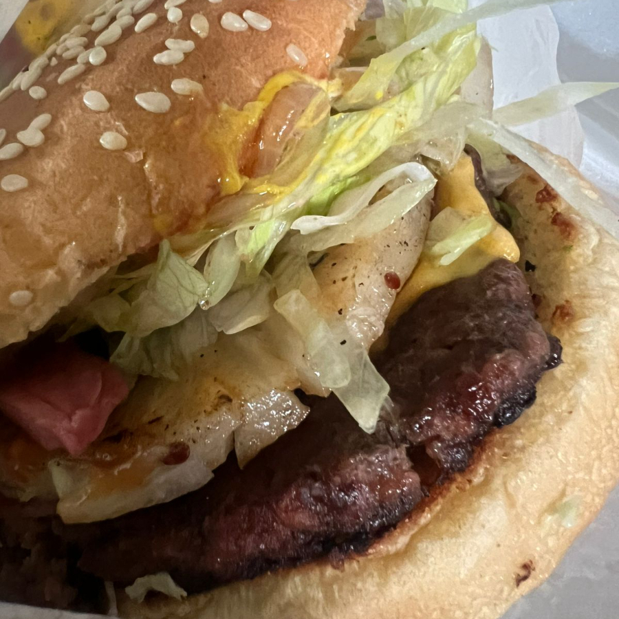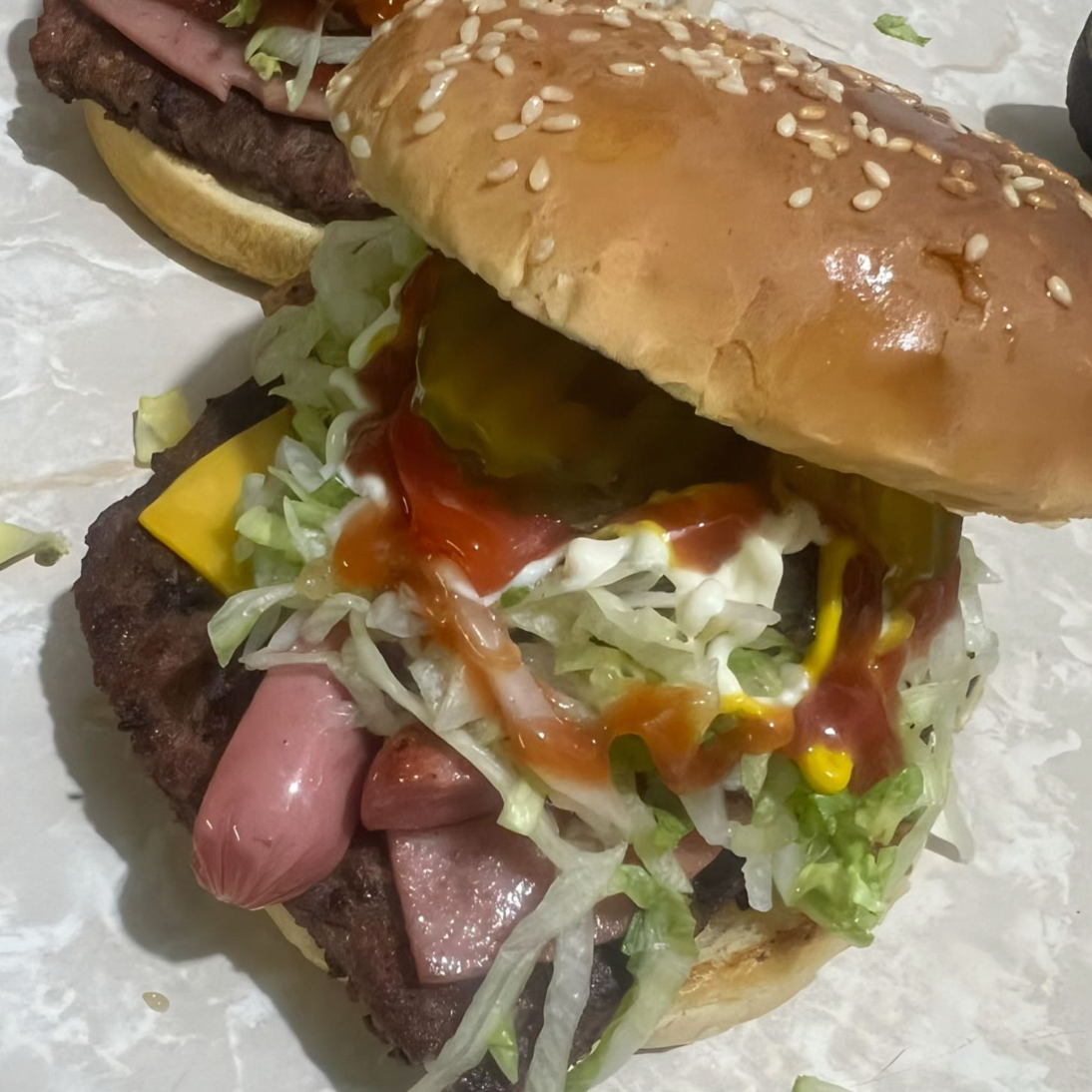 Doble carne, doble de todo (Lechuga, tomate, pepinillos, queso amarillo, cebolla caramelizada, winnie, jamón, aguacate y 3 líquidos.