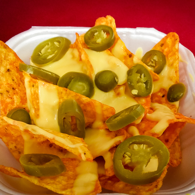 Ricos doritos rojos con frijoles graneados, queso cheddar y rodajas de chile jalapeño.