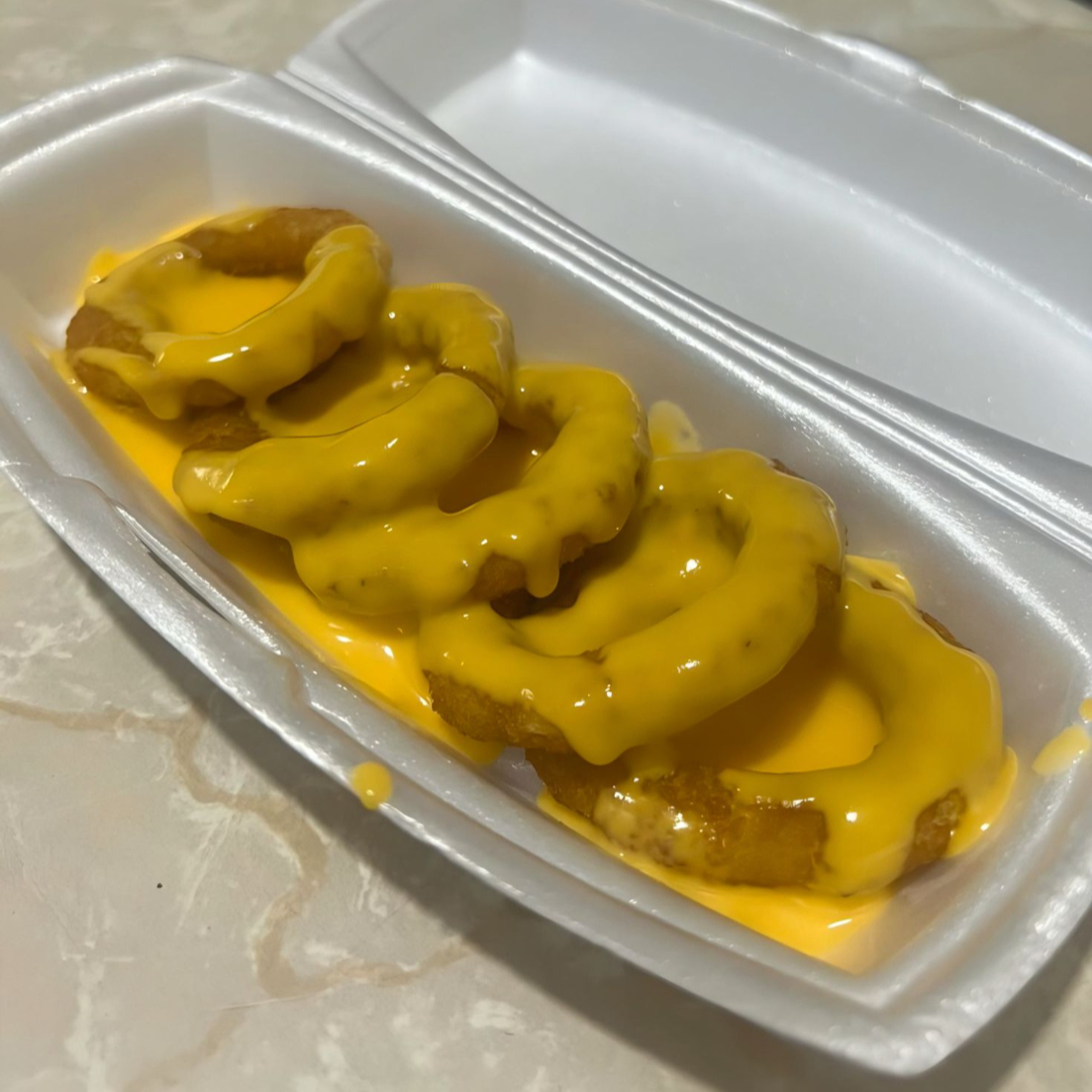 Rica orden de 5 Aros de Cebolla bañados en queso cheddar