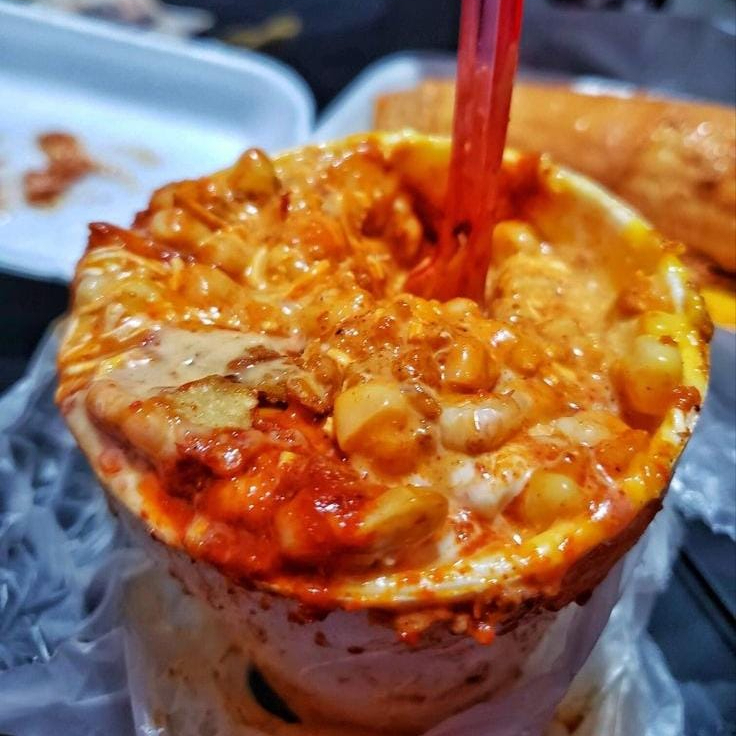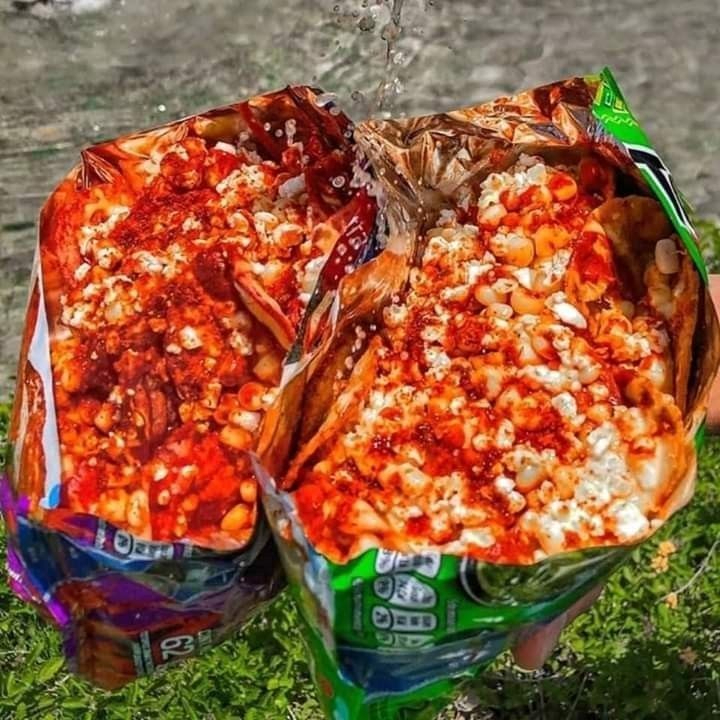 ¡El snack más divertido y lleno de sabor! Cheetos Flaming Hot, Doritos o Tostitos, cubiertos con elote blanco, queso amarillo, crema y queso en polvo. ¡Personalízalo con jalapeños, limón o salsa Valentina!