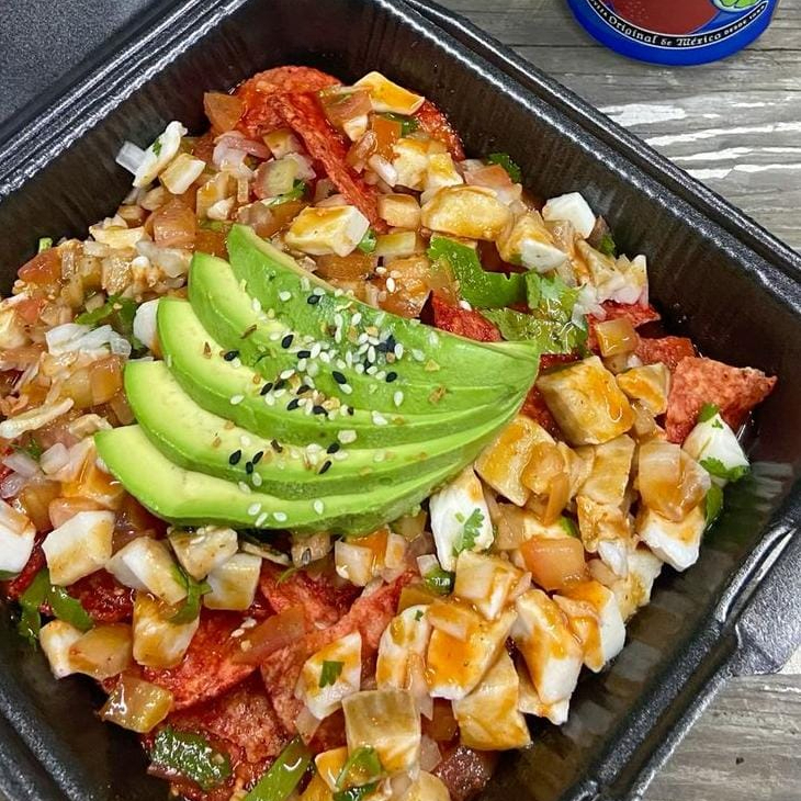 Una combinación única de camarón fresco con tostitos verdes y morados, mezclado con cilantro, pepino, tomate, cebolla y aguacate. Acompaña con un toque de limón, soya o salsa Valentina al gusto. ¡Una explosión de sabores frescos y texturas crujientes en cada bocado!